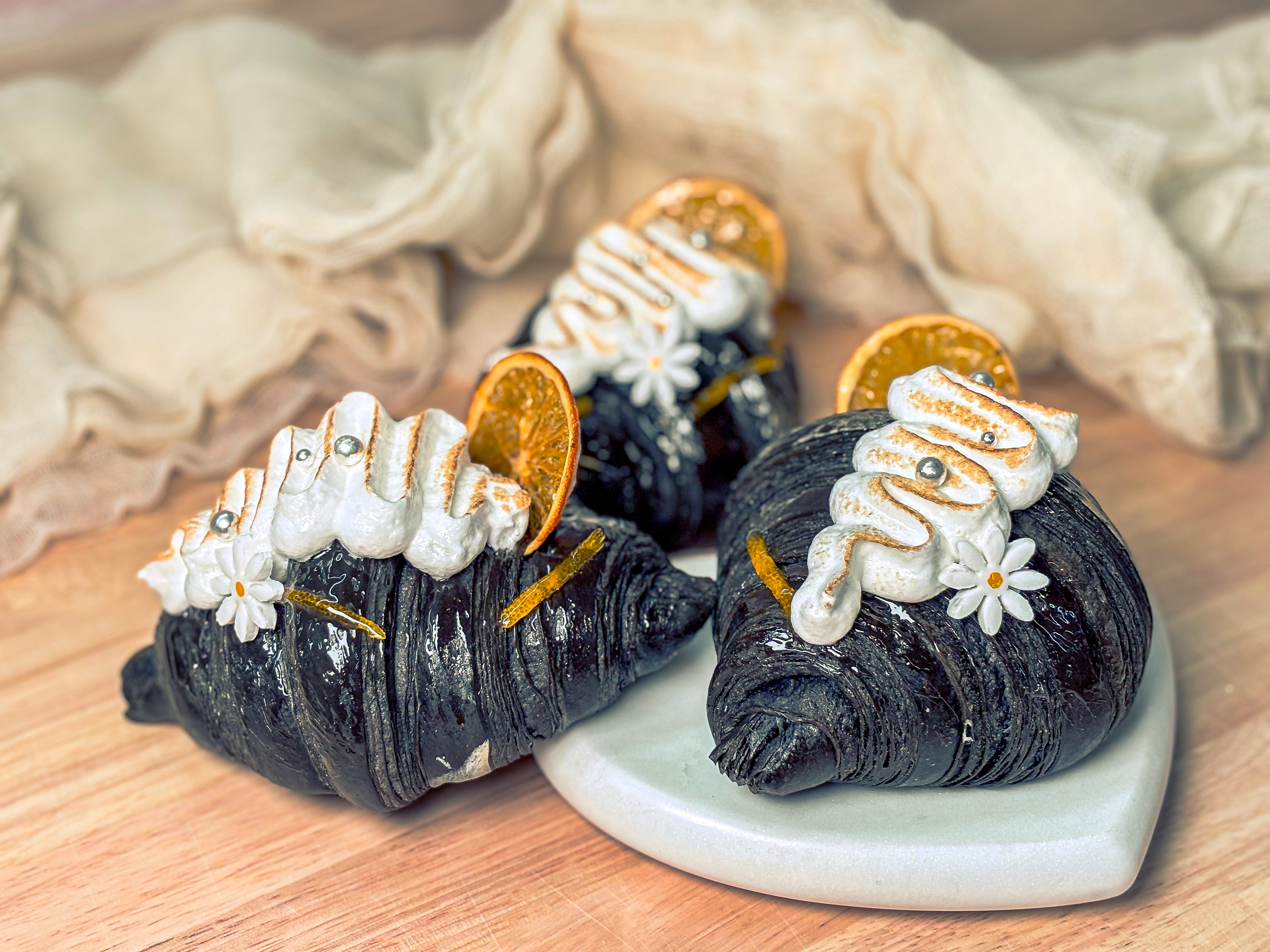 Midnight Croissant – a poetic night captured in pastry. A Japanese charcoal–laminated croissant, its dark foldsglimmer under golden starlight. Inside, Earl Grey–infused dark chocolatecrémeux flows like midnight silk, entwined with a delicate vein of candiedorange and blueberry compote. On top, a slice oforange rises as the glowing moon, while swirls of toasted meringue drift likesoft moonlight. Silver pearls orbit gently around it — tiny planets in a quietgalaxy. A creation that tastes as magical as it looks — elegant, mysterious, and dreamlike.
