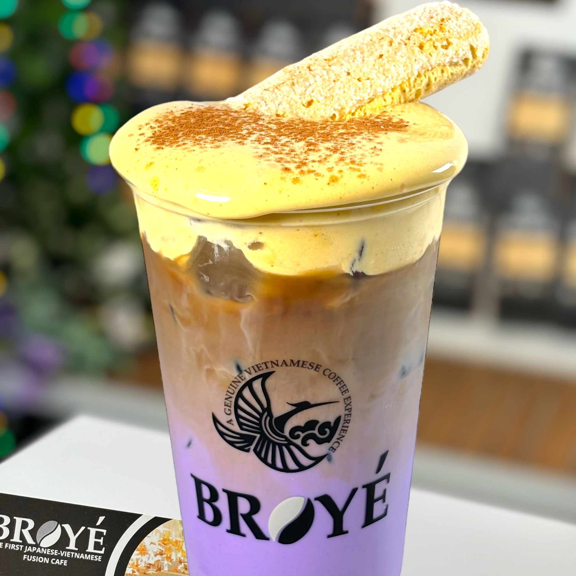 Indulge in our signature Ube latte infused with a tantalizing twist of special tiramisu cream inspired by Vietnamese Egg Coffee. Elevate your taste experience with a delicate ladyfinger garnish, adding a touch of elegance to every sip.